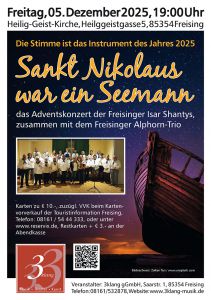 Karten zu € 10.-, zuzügl. VVK beim Kartenvorverkauf der Touristinformation Freising, Telefon: 08161/ 54 44 333, oder unter www.reservix.de, Restkarten + € 3.- an der Abendkasse