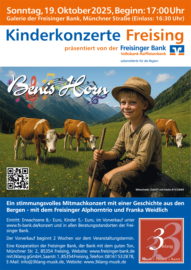 Ein stimmungsvolles Mitmachkonzert mit einer Geschichte aus den Bergen, rund um den Hirten Beni, der auf der Alm drei Kühe verliert und sie nach einer abenteuerlichen Suche endlich wiederfindet.