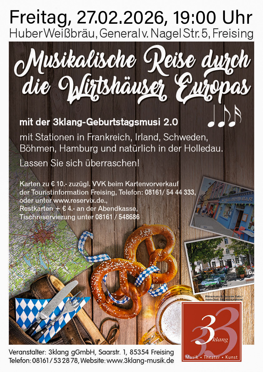 Viele kennen und lieben sie: die 3klang Geburtstagsmusi, die schon bei vielen Wirtshaus- und Biergarten- Musis für gemütliche Stimmung gesorgt haben. An diesem Abend zeigen sich die Musiker auch von einer ganz neuen Seite. Neben bayerisch-böhmischer Blasmusik wird auch Musik aus Frankreich, Irland und Osteuropa, in teils ungewöhnlicher Besetzung mit Flöte, Violine, Flügelhorn, Akkordeon und Fagott zu hören sein. Eine Sängerin wir außerdem einen besonderen, musikalischen Akzent an diesem Abend setzen. Die Zuhörer und Zuhörerinnen erwartet eine musikalische Reise durch verschiedene Länder Europas.