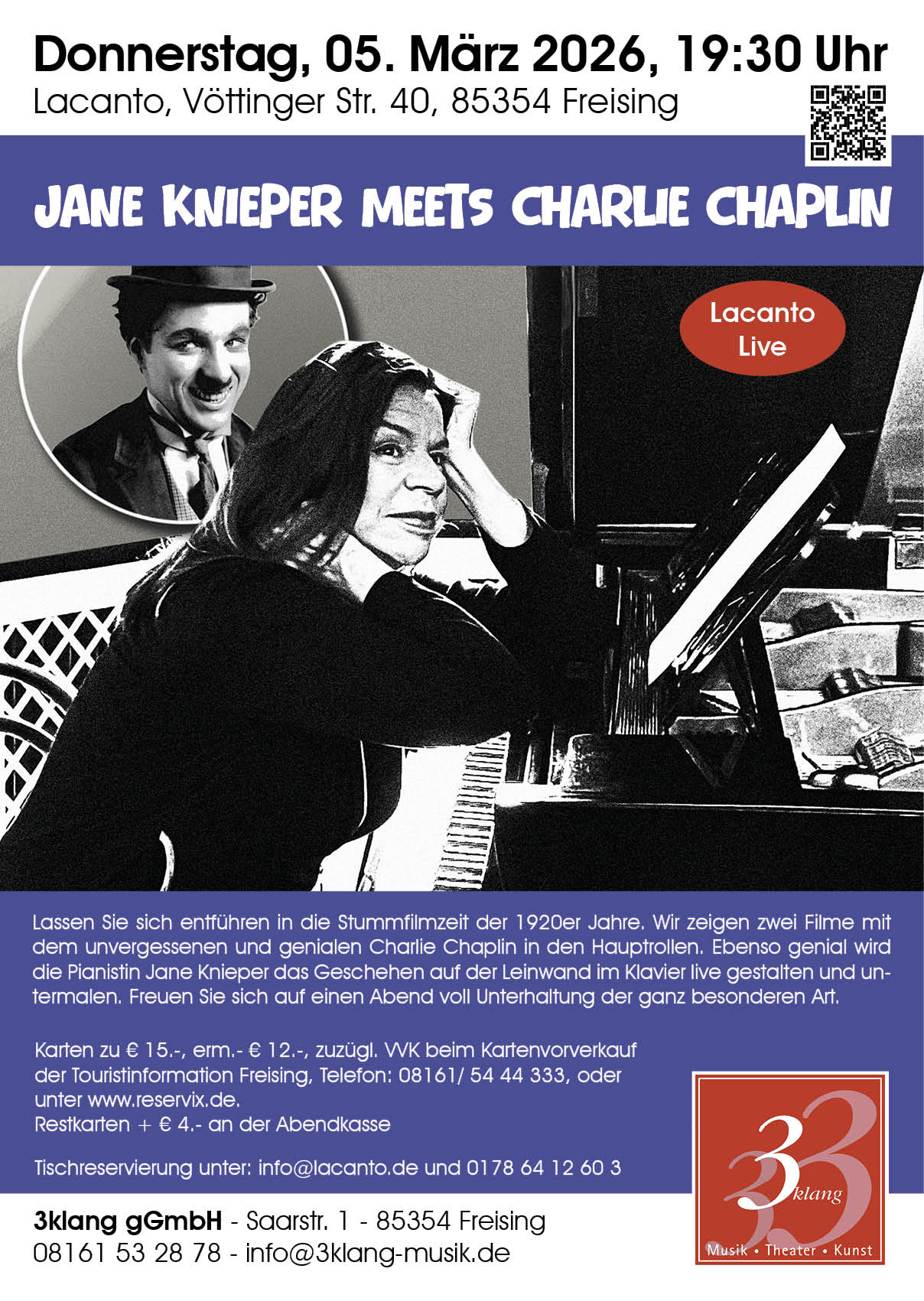 Lassen Sie sich entführen in die Stummfilmzeit der 1920er Jahre. Wir zeigen zwei Filme mit dem unvergessenen und genialen Charlie Chaplin in den Hauptrollen. Ebenso genial wird die Pianistin Jane Knieper das Geschehen auf der Leinwand im Klavier live gestalten und untermalen. Freuen Sie sich auf einen Abend voll Unterhaltung der ganz besonderen Art.