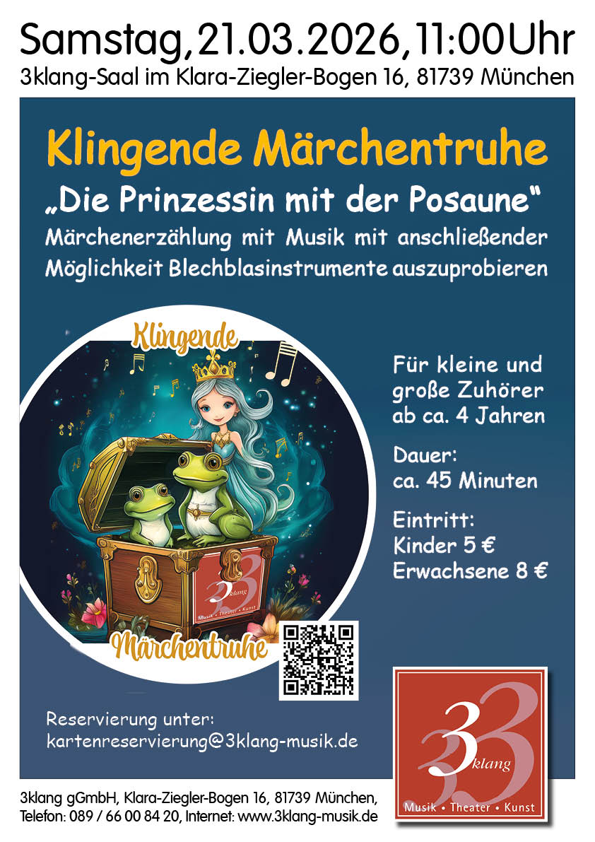 Am Samstag, den 21. März, 11 Uhr, entlockt unsere Erzählerin Claudia Forster der “klingenden Märchentruhe“ im Klara-Ziegler-Bogen 16 in Waldperlach das musikalische Märchen „Die Prinzessin mit der Posaune“.