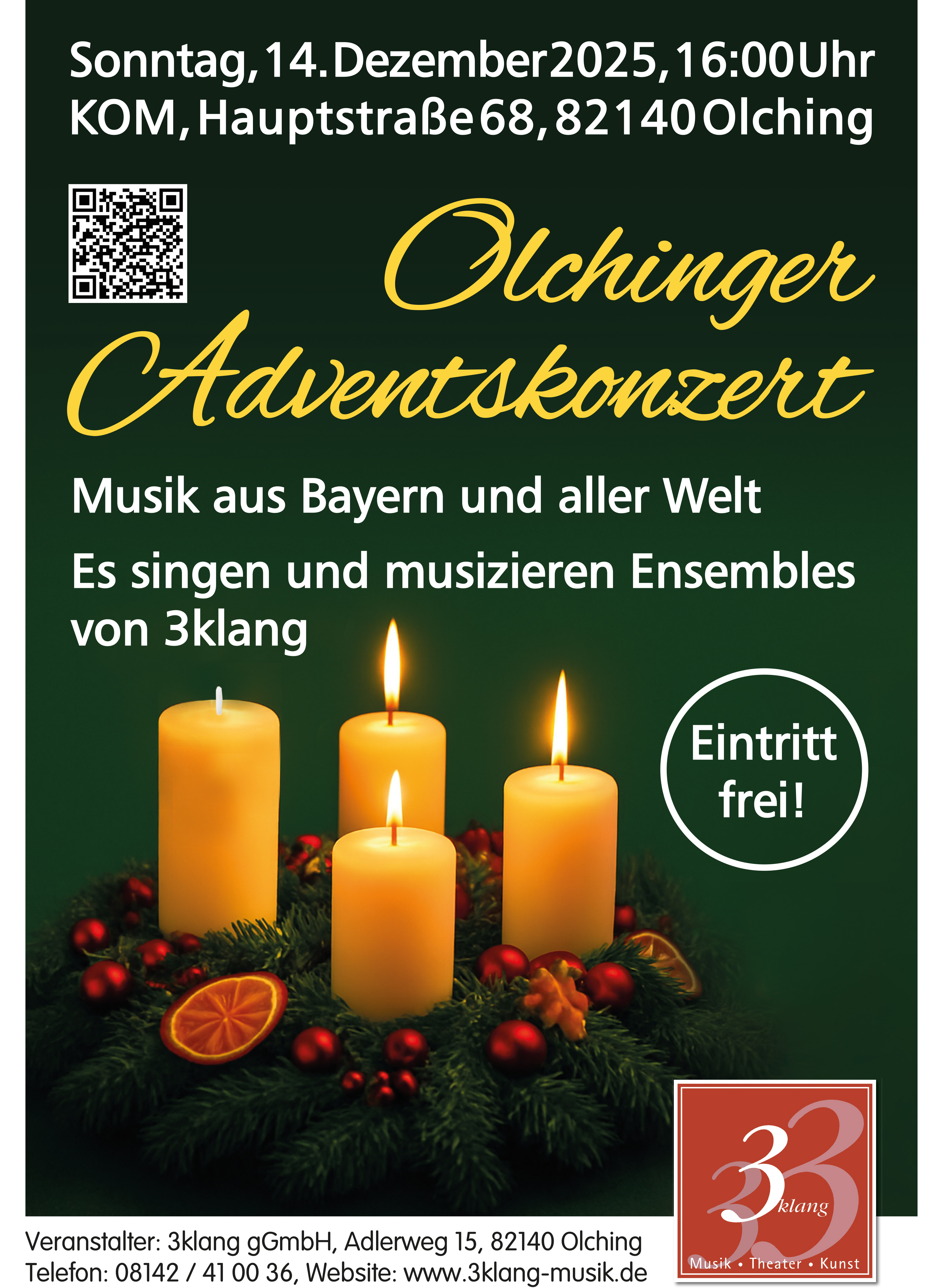 Gemeinsames Musizieren, das hat ganz besonders in der Adventszeit Tradition. Und so findet auch in diesem Jahr wieder das traditionelle Olchinger Adventskonzert von 3klang, der Olchinger Schule für Musik, im KOM statt. Es wird Musik aus Bayern und aller Welt erklingen, vorgetragen von 3klang Ensembles, in denen sich Kinder, Jugendliche und Erwachsene zusammengetan haben, um mit der Stimme oder auf ihren Instrumenten Lieder und Musikstücke zu präsentieren. Auch das Publikum wird mit einbezogen, so dass nach dem Konzert alle in froher