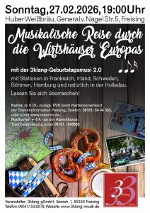 Viele kennen und lieben sie: die 3klang Geburtstagsmusi, die schon bei vielen Wirtshaus- und Biergarten- Musis für gemütliche Stimmung gesorgt haben. An diesem Abend zeigen sich die Musiker auch von einer ganz neuen Seite. Neben bayerisch-böhmischer Blasmusik wird auch Musik aus Frankreich, Irland und Osteuropa, in teils ungewöhnlicher Besetzung mit Flöte, Violine, Flügelhorn, Akkordeon und Fagott zu hören sein. Eine Sängerin wir außerdem einen besonderen, musikalischen Akzent an diesem Abend setzen. Die Zuhörer und Zuhörerinnen erwartet eine musikalische Reise durch verschiedene Länder Europas.